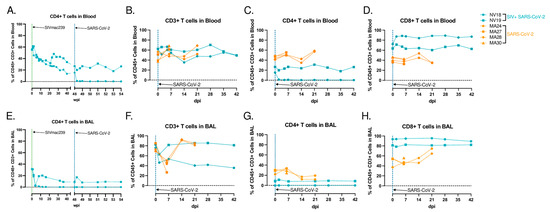 T-cell dynamics in blood and BAL following SARS-CoV-2 infection of SIV+ and SIV-naïve PTMs. CD4+ T-cell kinetics in blood (A) and BAL (E), following SIVmac239 and SARS-CoV-2 infection. (B–D,F–H) show peripheral and pulmonary T-cell dynamics in SIV+ SARS-CoV-2 coinfected PTMs in blue and SIV-naïve SARS-CoV-2-infected PTMs in orange. Comparison of overall CD3+ T-cell populations (B,F) as well as T-cell subsets; CD4+ (C,G), CD8+ (D,H).