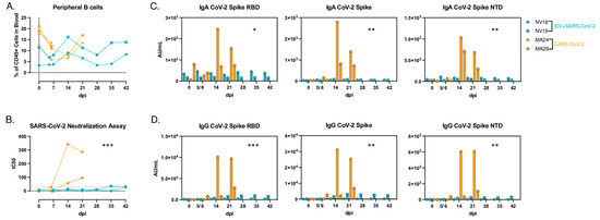 Humoral immune response to SARS-CoV-2 infection. (A) B cell frequencies in PBMCs after SARS-CoV-2 infection. (B) Live SARS-CoV-2 neutralization in serum using a PRMNT assay with Vero TMPRSS2 cells. (B,C) Meso Scale analysis of IgA- (C) and IgG- (D) binding antibodies to SARS-CoV-2 spike receptor binding domain (RBD), spike glycoprotein 1 and 2 (S1&S2), and spike N-terminal domain (NTD). Linear mixed-effects model was used to determine significance of the interaction of time (dpi) and group (Coinfected vs SARS-CoV-2 only). * p < 0.05, ** p < 0.01; *** p < 0.001.