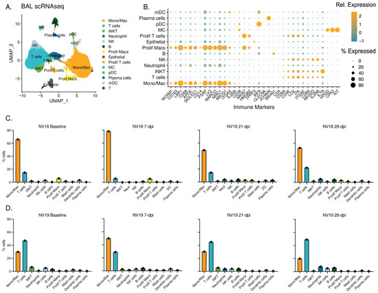 Single-cell classification and dynamics of bronchoalveolar lavage cell populations during SIV/SARS-CoV-2 coinfection. (A) UMAP plots illustrating scRNAseq data obtained from BAL sampling of PTMs (NV18 and NV19) coinfected with SIV and SARS-CoV-2. (B) Gene markers utilized for cell type identification. Dot color represents relative gene expression (Rel. Expression), while dot size indicates the proportion of cells expressing the gene (% Expression). Refer to supplemental Figure S6 for additional genes used. (C,D) Immune cell dynamics in BAL during SARS-CoV-2 infection for the more immunocomprimised animal, NV18 (C), and NV19 (D). The baseline (BL) sample was collected prior to SARS-CoV-2 exposure at 48 weeks post-SIV infection. MC = mast cells, pDC = plasmacytoid dendritic cells, mDC = myeloid dendritic cells, NK = natural killer cells.