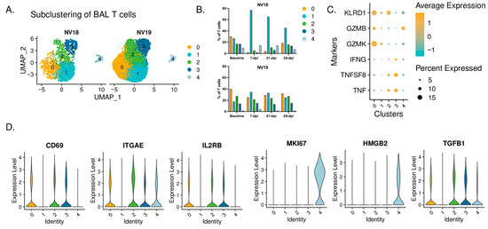 We also examined T-cell dynamics in the coinfected animals (Figure 10). Using subclustering analysis, we identified five distinct T-cell subclusters, each with unique phenotypic characteristics. Populations 0, 2, and 3 had elevated expressions of CD69 and ITGAE (CD103) (Figure 10D), indicative of a tissue-resident phenotype (TRM). Cluster 0 displayed a more cytotoxic phenotype, characterized by elevated expressions of KLRD1, GZMB, and GZMK (Figure 10C). Cluster 3 demonstrated an inflammatory phenotype, with greater expressions of IFN-γ and tumor necrosis factor (TNF) cytokines TNF and TNFSF8, while cluster 2 represented an intermediate phenotype (Figure 10C). Additionally, we identified infiltrating T cells (cluster 1) and proliferating T cells (cluster 4, MKI67hi and HMGB2hi) (Figure 10D).