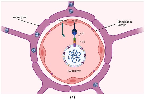 Crossing the BBB (blood–brain barrier) is a typical pathway for blood-borne viruses to enter the brain. The virus was found to spread into the circulation in COVID-19 patients, though at varying rates (1% to 41%), and may enter the brain by crossing the BBB [,]. Internalization and transport of the virus through the cerebral endothelium, where the expression of SARS-CoV-2 docking proteins is unknown, would be required to cross the intact BBB. Immunoreactivity to ACE2 was found in the brain arteries of a patient who died from repeated ischemic infarctions but the precise cellular location remains unknown []. Entry via additional putative SARS-CoV-2 receptors, such as NRP1 and BSG, which are more broadly expressed in the cerebral vasculature, cannot be ruled out. SARS-CoV-2-associated cytokines, such as interleukin (IL)-6, IL-1b, tumor necrosis factor (TNF), and IL-17, damage the BBB, perhaps allowing the virus to enter []. SARS-CoV-2 has been suggested to cause endothelial infection and inflammation in peripheral vessels but no direct evidence has been found in brain endothelial cells. Rather, multiple autopsy studies have revealed a lack of florid cerebrovascular inflammation [,,,]. COVID-19 co-morbidities, such as cardiovascular risk factors or pre-existing neurological disorders, may increase BBB permeability alone or in combination with cytokines. For example, electron imaging detected viral particles in frontal lobe microvessels and neurons in a COVID-19 patient with Parkinson’s disease, implying trans-endothelial entry []. SARS-CoV-2 might potentially enter the brain through the hypothalamic median eminence and other circumventricular organs, as well as other brain areas that have a permeable BBB due to fenestrated capillary walls. Although the viral particle is bigger than endothelial fenestrae, preliminary results show that capillaries in the median eminence express ACE2 and TMPRSS, which might facilitate virus passage into the hypothalamus (Figure 1a) [], which, under its extensive connections, might act as a portal to the whole brain.