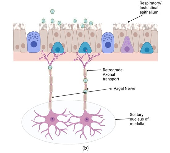 For viral transmission along the axon into the perikaryon, retrograde transport machinery can be used (Figure 1b) []. Colchicine and vinblastine disrupt microtubules, which impair neural transport and inhibit the reproduction of the murine hepatitis virus (MHV) []. Several respiratory viruses, including H5N1, have been found to move from the respiratory system to the brain via the vagus nerve in animal studies []. The perikaryon of vagal sensory neurons is located in the solitary nucleus of the medulla, linked to the medulla’s respiratory center and the pons. If the infection reaches the solitary nucleus, the respiratory center may be at risk, leading to respiratory failure. In addition to retrograde transport, SARS-CoV-2, like other coronaviruses, may use the axonal endoplasmic reticulum of infected neurons to spread to the brain [].