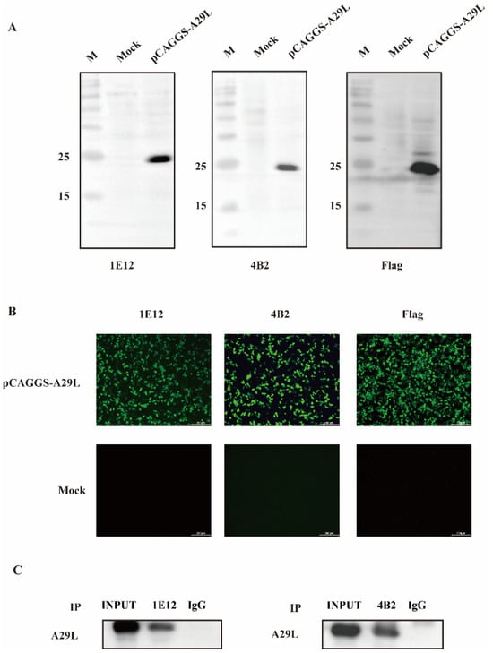 The specificity and immunogenicity of the mAbs 1E12 and 4B2 were assessed using Western blotting and IFA. Initially, the A29L protein was overexpressed in HEK-293T cells, and the samples were subjected to Western blot and IFA analyses. Both mAbs 1E12 and 4B2 specifically recognized the A29L protein, as depicted in Figure 2A,B. Furthermore, the results of the IP assays conducted on the HEK-293T cell lysates using the mAbs 1E12 and 4B2 demonstrate their ability to effectively enrich the A29L protein (Figure 2C).