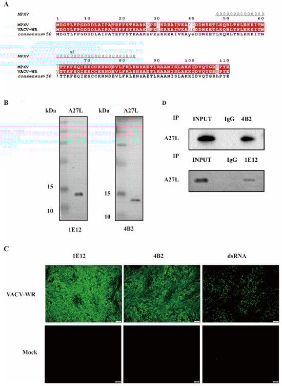 The cross-reactivity of mAbs 1E12 and 4B2 against the A27L protein of VACV. (A) A comparison of the amino acid sequence similarity between MPXV A29L and VACV WR A27L. (B) The Western blot detection of mAbs. The reactivity of mAb 1E12 and mAb 4B2 with the VACV WR A27L protein in infected cells was analyzed by Western blotting. (C) The IFA detection of mAb 1E12 and mAb 4B2 in VACV WR-infected cells. The green fluorescence represents the reaction of mAb 1E12 and mAb 4B2 with A27L in different strains of VACV. (D) The detection of the IP capacities of mAb 1E12 and mAb 4B2. The VACV WR-infected cells were lysed and immunoprecipitated with either mAb 1E12 or mAb 4B2. The precipitates were analyzed by Western blotting using antibodies against A27L.