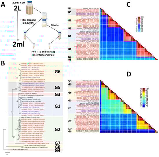 (A) Schematic representation of the wastewater processing workflow used in this study. (B–D) Genetic characterization of CanPV variants. (B) Maximum likelihood (ML) tree of CanPV variants present in GenBank as of June 2023 and those recovered in this study. The ML tree was inferred using IQ-Tree 1.6.12., with the best substitution model (TIM2 + F + I + G4) selected using ModelFinder. (C,D) Pairwise similarity analysis of CanPV variants in (B). (C) Cut-offs at >87% (i.e., <13% divergence) in 2 colors. (D) The same similarity profile in rainbow mode. Please note that sequences whose names are labeled with a red color were the ones generated in this study. Those with asterisks did not have the complete capsid sequence. Those in purple were previously described by our group and detected serendipitously while screening for enteroviruses. Those in black were described by others and downloaded from GenBank.