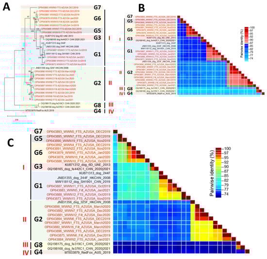 Genetic characterization of CanPV variants for which complete capsid (VP4-VP1) sequences were available. Please note that sequences in Figure 1 highlighted purple and those with triple asterisks were not included in this analysis because they did not contain the complete capsid sequence. (A) Maximum likelihood (ML) tree of complete capsid sequences of CanPV variants present in GenBank as of June 2023 and those recovered in this study. The ML tree was inferred using IQ-Tree 1.6.12., with the best substitution model (TIM2 + F + I + G4) selected using ModelFinder. (B,C) Pairwise similarity analysis of CanPV variants in (A). (B) Cut-offs at 86% (i.e., 14% divergence) in 2 colors. (C) The same similarity profile in rainbow mode.