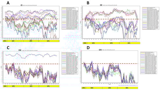 Simplot analysis showing the <20% diversity threshold for each cluster. In (A–D), a member of each of the clusters I, II, III, and IV, respectively, was selected as a query.