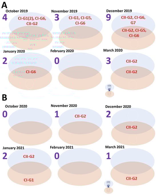 CanPV variants detected in different fractions, FTS (top, blue oval) and filtrate (bottom, beige oval), of WW from October 2019 to March 2020 (A) and October 2020 to March 2021 (B). Those detected in both are in the overlapping region of both ovals. The blue number beneath each month shows the number of variants detected per month.