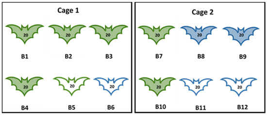 Experiment I. Number, sex of bats, MARV inoculation status, and the number of bat fleas released on Egyptian rousette bats. B = bat identification number 1–12; green outline = female; blue outline = male; number on the bat = number of fleas released on each bat; coloured-in bats = bats inoculated with Marburg virus; uncoloured bats = mock-inoculated bats.