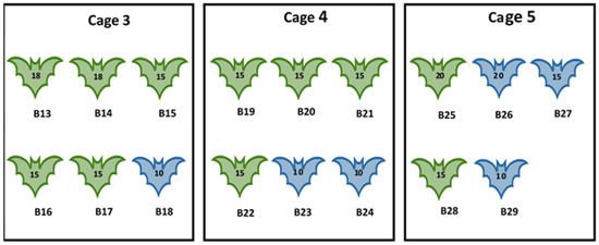 Experiment II. Number, sex of bats, and the number of MARV-inoculated fleas released on Egyptian rousette bats. B = bat identification number 13–29; green outline = female; blue outline = male; number on the bat = number of MARV-inoculated flies released on each bat.