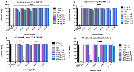 Cytotoxicity assays were achieved in 96-well culture plates and determined by [3-(4,5-dimethylthiazol-2-yl)-2,5-diphenyltetrazolium bromide] (MTT) measurements. (Sigma-Aldrich, St. Louis, MO, USA). Briefly, 2 × 104 cells/mL VERO/hSLAM or Vero CCL-81 cells were seeded in a 96-well plate, and, the next day, they were treated in triplicate with different concentrations of extracts ranging from 25 to 400 µg/mL for 24 h (h). Then, 100 μL of MTT solution (5 mg/mL) was added to each well and incubated for 3 h at 37 °C to allow the reduction of MTT solution from yellow to blue in metabolically active vital cells [27]. Finally, the plate was emptied, and 100 µL of DMSO (100%) was added to each well to dissolve the formazan crystals. The untreated cells were used as a positive control, while the cells treated with 100 µL of DMSO (100%) represented the negative control; PBS was added as solvent control. Lastly, cell viability was calculated by reading the absorbance at 570 nm with a microplate reader.