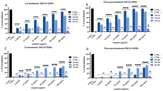 Antiviral activity of M. oleifera extracts against HCoV-229E. Co-treatment test (A) and virus pre-treatment (B) of MwS extracts; co-treatment test (C) and virus pre-treatment test (D) of MwB extracts. Algal extract at 50 µg/mL was used as a positive control (CTRL+), while infected and untreated cells represented negative control (CTRL−). Two-way ANOVA was used for statistical analysis. The Dunnett test was used for multiple comparisons. **** p < 0.0001, *** p ≤ 0.0002, * p < 0.0332, ns: not statistically significant.