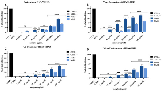 Antiviral activity of M. oleifera extracts against HCoV-229E. Co-treatment test (A) and virus pre-treatment (B) of MaS extracts; co-treatment (C) and pre-treatment test (D) of MaB extracts. Algal extract at 50 µg/mL was used as a positive control (CTRL+), while infected and untreated cells represented negative control (CTRL−). Two-way ANOVA was used for statistical analysis. The Dunnett test was used for multiple comparisons. **** p < 0.0001, *** p ≤ 0.0002, ** p < 0.0021, * p < 0.0332, ns: not statistically significant.