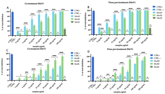 Antiviral activity of M. oleifera extracts against MeV. Co-treatment test (A) and virus pre-treatment (B) of MwS extracts; co-treatment test (C) and virus pre-treatment test of MwB extracts (D). The peptide AR-23 at 25 µg/mL was used as a positive control (CTRL+), while infected and untreated cells represented negative control (CTRL−). Two-way ANOVA was used for statistical analysis. The Dunnett test was used for multiple comparisons. **** p < 0.0001, *** p ≤ 0.0002, ** p < 0.0021, * p < 0.0332, ns: not statistically significant.