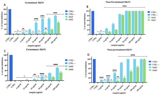 Antiviral activity of M. oleifera extracts against MeV. Co-treatment test (A) and virus pre-treatment (B) of MaS extracts; co-treatment (C) and pre-treatment test (D) of MaB extracts. The peptide AR-23 at 25 µg/mL was used as a positive control (CTRL+), while infected and untreated cells represented negative control (CTRL−). Two-way ANOVA was used for statistical analysis. The Dunnett test was used for multiple comparisons. **** p < 0.0001, ** p < 0.0021, ns: not statistically significant.