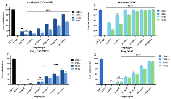 Therefore, in further investigating the mode of action, we used MwS extracts to study the early stages of the viral cycle, i.e., attachment and entry in the host cell [32] (Figure 6). In the attachment assay, the cells were pre-cooled at 4 °C and then co-treated with extracts and virus for 1 h. The low temperature favors the binding between viral and cellular membranes but does not allow the entry of the virus inside the cell. The results indicated an inhibition of MwS3 and MwS2 against HCoV-229E of 60% and 38% up to 100 µg/mL (Figure 6A). The activity was higher against MeV with a total inhibition at the highest concentrations, and 80% and 50% inhibition up to 12 µg/mL (Figure 6B). In the entry assay, the cells were first infected at 4 °C and then treated with extracts at 37 °C for 1 h. At low temperatures, the virus binds to the membrane, so the subsequent shift to 37 °C immediately enables the virus to enter the cell. Here again, MwS3 and MwS2 presented 40% and 35% inhibition up to 100 µg/mL (Figure 6C), while the same results were detected at the lower concentration of 50 µg/mL against MeV (Figure 6D).