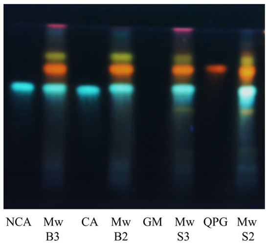 HPTLC profile of M. oleifera extracts obtained under microwave irradiation and four reference standards sprayed with NP/PEG reagent; MwB2 and MwB3: M. oleifera Barletta extracted with 50% EtOH and 70% EtOH, respectively; MwS2 andMwS3: M. oleifera Salento extracted with 50% EtOH and 70% EtOH, respectively; CA: chlorogenic acid; NCA: neochlorogenic acid; QPG: quercetin 3-O-β-d-glucopyranoside; GM: glucomoringin; solvent: ethyl acetate/formic acid/acetic acid/water (100:11:11:26); λ: 366 nm.