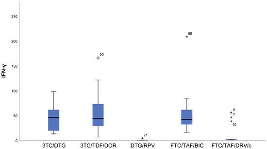 Figure 1. Distribution of IFN-γ depending on the cART regimen. Patients following DTG/RPV and FTC/TAF/DRV/c regimens had almost zero IFN-γ levels. IQR (interquartile range) is narrower for the FTC/TAF/BIC regimen than the 3TC/DTG and 3TC/TDF/DOR regimen, i.e., the values vary to the smallest degree. * The symbol * means extreme values. The symbol ° means outliers.