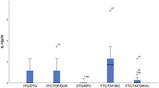 Figure 2. Distribution of IL12p70 depending on the cART regimen. The lowest IL-12p70 values were observed in DTG/RPV patients. They were followed by those following the FTC/TAF/DRV/c regimen. * The symbol * means extreme values. The symbol ° means outliers. - With regards to IL12p70, only in the FTC/TAF/BIC regimen is the median distinctly higher, i.e., the patients from this group tend to show significantly higher values of this indicator compared to all other groups. Regarding the 3TC/DTG and 3TC/TFF/DOR regimens, the results are very similar (Figure 2).