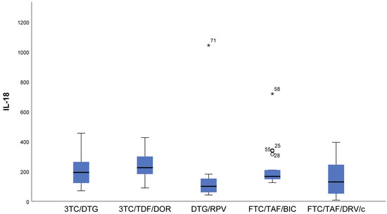 - IL-18 (p = 0.009) results showed that in patients following NRTIs+NNRTI (3TC/TDF/DOR) and NRTIs+INI or NRTI+INI (FTC/TAF/BIC and 3TC/DTG) regimens, higher values than in those following INI+NNRTI (DTG/RPV) and NRTIs+PI (FTC/TAF/DRV/c) regimens were observed, although we reported increased values for the other two regimens as well (Figure 3).