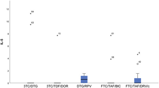 Figure 4. Distribution of IL-5 depending on the cART regimen. FTC/TAF/BIC, 3TC/DTG, and 3TC/TDF/DOR had the lowest IL-5 levels. One patient in the FTC/TAF/BIC group of the patients with significantly increased IL-5 values was found to be in advanced stages of immunodeficiency, although, at the time of the study, he had a satisfactory value of CD4 221 and type II DM. One patient in the FTC/TAF/BIC group was diagnosed with stage B of HIV infection and had very good values of CD4 854 at the time of the study and a co-morbid condition, duodenal ulcers. Both patients continued their treatment upon completion of another therapeutic regimen, and their ART regimen had a long duration—7.5 and 6 years, respectively. All other patients with significantly increased values were in stage A and had no known co-morbid conditions. * The symbol * means extreme values. The symbol ° means outliers. - There was a trend toward measurement of increased IL-5 values in the DTG/RPV and FTC/TAF/DRV/c groups, with these values being slightly higher for the DTG/RPV regimen (Figure 4).