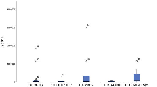 - The highest sCD14 (p = 0.082) values were reported in the NRTIs+PI (FTC/TAF/DRV/c) regimen, i.e., in a regimen containing a protease inhibitor. We found the lowest values in patients following NRTIs+INI or NRTI+INI (FTC/TAF/BIC and 3TC/DTG) and NRTIs+NNRTI (3TC/TDF/DOR) regimens (Figure 5).