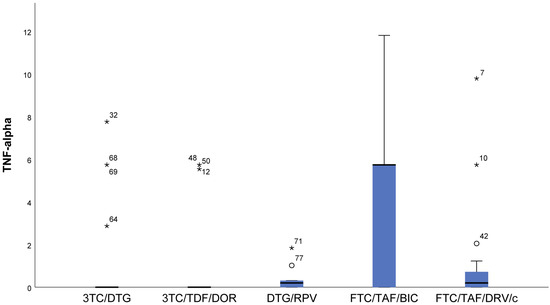 Figure 6. Distribution of TNF-α depending on the cART regimen. 3TC/DTG and 3TC/TDF/DOR regimens have the lowest values of TNF-α. * The symbol * means extreme values. The symbol ° means outliers.
