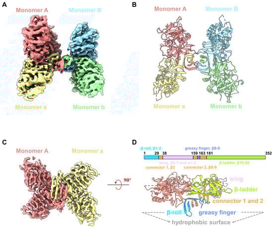 Recombinant YFV NS1 proteins (residues 1 to 352) were expressed in 293F cells and purified by nickel affinity chromatography and size-exclusive chromatography (SEC). Although the SDS-PAGE showed that the purified YFV sNS1 proteins as a single band, the retention volumes on the Superdex 200 Increase column ranged from 10.3 to 10.8 mL, indicating that the proteins form oligomers rather than dimers (Figure S1A). For cryoEM analysis, the peak fraction of the purified YFV sNS1 samples was concentrated and applied to cryo-grids, and 2702 movies were collected from a 300 kV Titan Krios (Figure S2). The two-dimensional (2D) class averages indicated that the sample was a mixture of tetramer and hexamer (Figure S1B,C). Since the tetramer dominates the particles, the 3D structure of the tetramer was generated after ab initio model generation. In order to address the issue of preferred orientation, 2053 movies stacks were collected by tilting the sample stage at 15°. The final reconstruction of 215,543 particles yielded a structure (named YFV_NS1_tetramer) at a 3.57 Å resolution (Figure 1A and Figure S2; Table 1). The local resolution map shows that one of the dimers is blurry with a worse resolution, indicating its flexibility. Then, we performed focused refinement by applying a mask on one of the dimers and improved the resolution to 3.31 Å (Figure S2; Table 1). The atomic models of the YFV_NS1_tetramer and focused refined dimer were built according to the density map (Figure 1A–D and Figure S2). The chains were named AaBb and Aa for NS1 tetramer and dimer, respectively. Most of the residues could be traced in the tetramer structure, but some residues in the wing domain loop region (109–128) and the β-ladder loop region (339–352) were missing due to density blurring.