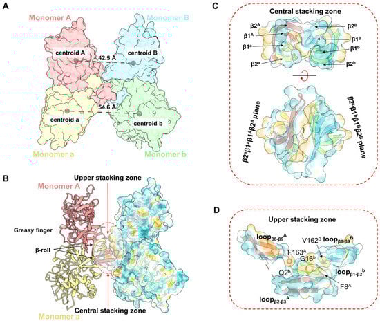 Assembly of YFV sNS1 tetramer. (A) Centroidal distance between dimer Aa and dimer Bb. The model of YFV NS1 tetramer is colored by chains and shown as surface. The centroids and corresponding distances are labeled in gray spheres and dashed lines. (B) Stacking zone in YFV NS1 tetramer. The YFV NS1 tetramer is presented in image. Surface model of Monomers B and b are presented with 80% transparency and colored by hydrophobicity. Upper and central stacking zones are highlighted in circles. (C) Interactions in the central stacking zone. Both side view (top) and top view (bottom) are presented. (D) Interactions in the upper stacking zone. Key residues (F8A, F163A, V162B, Q2b, G16b, analyzed by LigPlot+) are shown in sticks [31]. In (B–D), the cartoon models are colored by chains, and the surface models are colored by hydrophobicity in ChimeraX with 80% transparency.