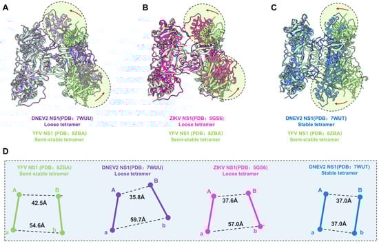 Comparison of YFV, ZIKV, and DENV2 NS1 tetramer models. (A–C) Atomic models of DENV2 NS1 loose tetramer, ZIKV NS1 loose tetramer, and DENV2 NS1 stable tetramer aligned to YFV NS1 semi-stable tetramer. Domain switch directions are highlighted in circles and indicated by red arrows. (D) Centroidal distance between dimer Aa and dimer Bb. The Centroid distances between Monomer A and B, and between Monomer a and b are measured for each of the structure presented in (A–C). Images of each NS1 and the corresponding centroids are colored, as follows: YFV NS1 semi-stable tetramer: light green; DENV2 NS1 loose tetramer: medium purple; ZIKV NS1 loose tetramer: deep pink; DENV2 NS1 stable tetramer: royal blue.