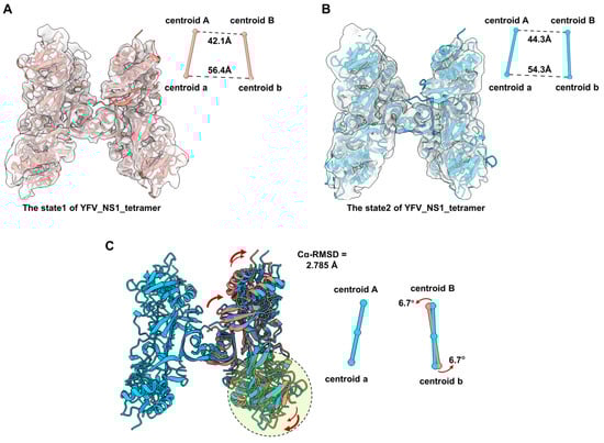 Comparison of the conformational change between two states of YFV_tetramer_NS1 models. (A,B) Atomic models of YFV NS1 tetramer in state1 and state2 (threshold levels: 0.128 and 0.108, respectively). (C) Comparation between the models of YFV_NS1_tetramer_state1 and YFV_NS1_tetramer_state 2. In (A–C), the centroids and dimer axes for each tetramer are shown near the atomic models in spheres and sticks. The centroidal distances are labeled in black dashed lines. The tilt directions and angles are labeled in red arrows. Models of each NS1 and the corresponding centroids and axes are colored, as follows: YFV_NS1_tetramer_state1: salmon; YFV_NS1_tetramer_state2: dodger blue.