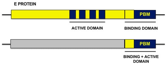 The influence of the PBMs of the SARS-CoV 3a and E proteins lies to a large extent in their potential interaction with cellular proteins with PDZ domains [5,7,23]. These interactions are involved in multiple cellular activities, and their alteration has significant effects on the behavior of viruses of different families [24,25,26,27]. For example, the PBM of the human papillomavirus (HPV-16) E6 oncoprotein interacts with many cellular proteins with PDZ motifs, facilitating tumorigenesis and virus dissemination [28]. Additionally, the F11 protein of the vaccinia virus has both a PDZ domain and a PBM that mediate virus dissemination [29]. Recently, it has been described that the PBM of the West Nile virus (WNV) non-structural protein 5 (NS5) is important for the replication of this virus [30].