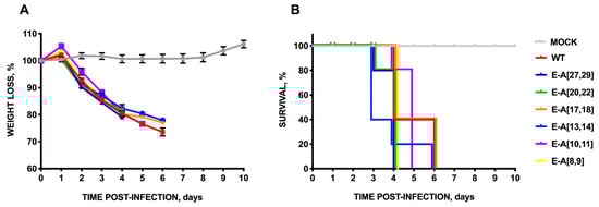 To address this question, an alanine scanning was performed on exposed polar amino acid pairs at the carboxyterminal end of E protein: rSARS-CoV-MA15-E-A[27,29], -E-A[20,22], -E-A[17,18], -E-A[13,14], -E-A[10,11], -E-A[8,9] (Figure 3A). The growth kinetics in cell culture (Figure 3B) and mice lungs (Figure 3C) were determined. Only the amino acid pairs located at positions 20 and 22 of E protein, counting from the carboxy-terminus, were necessary for optimum virus replication in cell cultures since mutant E-A[20,22] showed significantly lower titers compared to the parental virus at early time points, whereas the introduction of alternative alanine substitutions in other positions did not cause significant differences in virus replication. This reduction in virus titer was also observed in mice lung at two but not at four days. In contrast, the virulence of the substitution mutant E-A[20,22] was not significantly affected in terms of weight losses (Figure 4A) or survival (Figure 4B), suggesting that these mutations did not cause a strong effect on virus pathogenicity.
