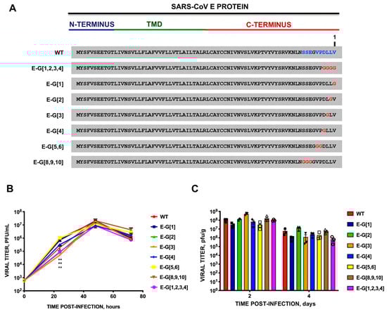 To further identify the relevance of the carboxy-terminal residues of E protein, potentially involved in the interaction between the virus PBM and the Syntenin-1 PDZ, a collection of mutants was generated in which residues of E protein potentially involved in this binding were replaced by glycine (Figure 5A). This change to G is based on an in silico modeling of the interaction between E protein PBM and Syntenin-1 PDZ. Single mutants of the PBM (rSARS-CoV-MA15-E-G[1], -E-G[2], -E-G[3], -E-G[4]), or double and triple mutants, in which adjacent residues were also substituted, were constructed, because of their proximity to the PBM core. A recombinant virus lacking the PBM of E protein was used as a control by replacing the four amino acids of the PBM with glycine (E-G[1,2,3,4]) (Figure 5A). The results showed that there were limited differences in virus titers (Figure 5B,C). All mice infected with the mutant lacking the E protein PBM (E-G[1,2,3,4]) regained weight and survived. However, all mice infected with the parental virus or with the other mutants lost weight (Figure 6A) and died between 4 and 7 dpi indicating minor differences in the pathogenicity of the different mutants (Figure 6B). These results indicated that the four residues could act as a virulence factor that the PBM of SARS-CoV E protein is a virulence factor. However, individual glycine substitutions within the PBM core, as well as double or triple replacements of adjacent amino acids outside the main core, were not sufficient to generate mutants with an attenuated phenotype, as observed in the case where four PBM core residues were replaced by glycine (Figure 6).