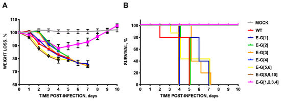 Virulence of SARS-CoV mutants with glycine substitutions in the carboxy-terminal residues of the E protein that may participate in the interaction of this protein with Syntenin-1 according to the structure proposed by the in silico model. Groups of five 16-week-old Balb/c mice were intranasally inoculated with DMEM (Mock, gray), or with 100,000 pfu/mouse of the parental SARS-CoV virus (WT), or with the glycine replacement mutants generated: E-G[1] (dark blue), E-G[2] (green), E-G[3] (orange), E-G[4] (blue), E-G[5,6] (yellow), E-G[8,9,10] (brown), E-G[1,2,3,4] (pink). Weight loss (A) and survival (B) were monitored for 10 dpi. Vertical bars represent the standard error of the mean weight of the mice.