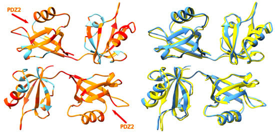 Effect of carboxyl-terminal binding of SARS-CoV E protein on the structure of Syntenin-1. The left panel shows free Syntenin-1 (blue) with regions that change colored by their variance (orange < orange-red < red) calculated by THESEUS, with both PDZ2 domains indicated by arrows. The right panel shows free Syntenin-1 (blue) superposed to the bound form (yellow).
