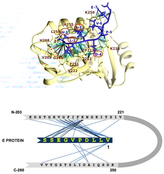 Taking into account the distribution of hydrogen bonds and contacts between the two proteins (PBM and Syntenin-1), Leu-2 and Val-1, seem to be the most relevant residues in the PBM. Hydrogen bonds between the PBM and Syntenin-1 are essentially established with Val-1, depending on the relative residue orientations which, according to molecular dynamics simulations, could change over time. A selected representative conformation obtained with the PDZ2 domain of Syntenin-1 and the last 10 amino acids of E protein with the most relevant hydrogen bonds and contacts observed are represented in Figure 8.