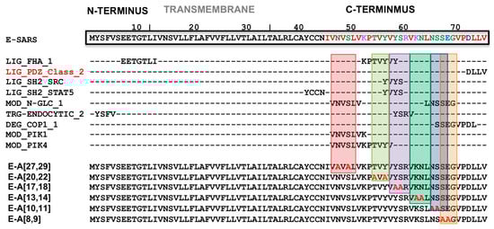 PBM-PDZ interactions, in principle, could extend beyond the four amino acids of the PBM, since adjacent amino acids of the PBM also may interact with PDZ domains [34]. In this work, we studied whether the effect of SARS-CoV E protein PBM on virus viability, replication, and virulence was influenced only by the four carboxyterminal residues of the PBM alone, or whether alternative residues at the N-terminus of the main motif could also affect virus viability. To clarify this possibility, recombinants of SARS-CoV with double mutations, affecting various polar residues of the carboxyl terminus that are frequently exposed, were constructed (Figure 3A). All substitution mutants were virulent in the mouse model. Therefore, no functional motif has been identified so far in the carboxyl terminus, apart from the four PBM amino acids, that were relevant to the virulence of SARS-CoV. However, the E-A[20,22] replacing mutant had the lowest viral titer both in vitro and in vivo indicating that these residues are relevant in the infection cycle of SARS-CoV. It was predicted that in the E-A[20,22] mutant, two functional motifs were affected by these mutations: (i) the FHA domain binding motif (FHA-BM) and (ii) phosphotyrosine ligands bound by SH2 domains (Figure 9) [35]. The functional FHA-BM C-terminal carboxyl group is conserved in SARS-CoV and MERS-CoV. FHA domains are the only signaling domains that specifically recognize phosphothreonine (pThr) residues [36,37,38]. This type of protein–phosphoprotein interaction is present in a wide variety of prokaryotic and eukaryotic proteins [39] and is involved in various cellular functions such as signal transduction, vesicular trafficking, and cell cycle control [40,41,42,43,44,45].