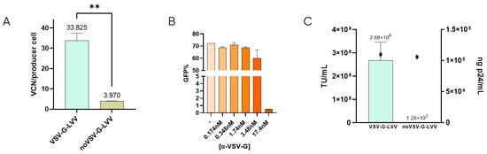 Retro-transduction during LVV production mainly occurs via VSV-G envelope protein. (A) Comparison of retro-transduction events analysis (TIPs) in VSV-G-LVV and LVV missing VSV-G envelope. Statistical analysis was performed using an unpaired t-test (** = p < 0.01). (B) LVV transduction efficiency in the presence of increasing concentrations of a VSV-G antibody. (C) Functional (bars) and physical (circles) titres were obtained for LVV with and without VSV-G. Each experiment is the average of two biological replicates. Error bars indicate standard deviation.