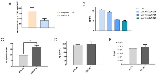 sLDLR producer cell line production and analysis. (A) Evaluation of sLDLR gene expression level in sLDLR+ in comparison to HEK293T cells. (B) LVV transduction efficiency in the presence of sLDLR+ supernatant at different production times of sLDLR+ cells. (C) LVV transduction in sLDLR+ and HEK293T producer cells (TIPs). Statistical analysis was performed using an unpaired t-test (* = p < 0.05). (D) Physical and (E) infective titers of LVV produced in sLDLR+ and HEK293T cell lines. Each experiment is the average of two biological replicates. Error bars indicate standard deviation.