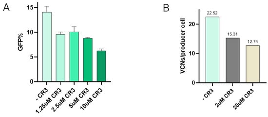 Addition of CR3 to reduce retro-transduction. (A) Transduction efficiency assay in the presence of increasing concentrations of CR3 peptide. Each experiment is the average of two biological replicates. Error bars indicate standard deviation. (B) Retro-transduction events analysis in LVV production in the presence of CR3 peptide.
