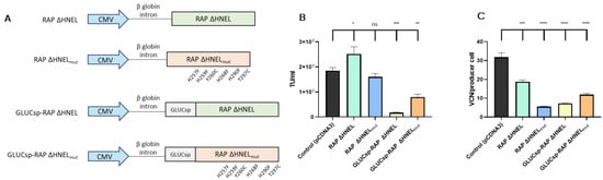 A third strategy evaluated to reduce LVV re-entry in producer cells aimed to block VSV-G receptor (LDLR) through the secretion of soluble RAP to the supernatant. Four plasmids expressing different RAP versions were used, as shown in Figure 4A. First, the C-terminal sequence implicated in RAP recycling, HNEL, was removed to promote protein secretion (RAP ΔHNEL [27]). Using the RAP ΔHNEL construct as a template, the other three constructs were designed. Since in the current experimental setup, RAP secretion to the extracellular space is essential to block the interaction between LDLR and VSV-G, a signal sequence from Gaussia Luciferase (GLUCsp) was added to boost protein secretion by HEK293T cells [34]. Additionally, based on previous studies [35], six mutations were introduced in the RAP sequence (H257F, H259F, Y260C, H268F, H290F, T297C) to increase its stability and maintain its binding capacity to LRPs at acidic pHs. The four histidine mutations were expected to avoid RAP conformational change that causes the protein to release the LDLR receptors at acidic pH [29]. Also, the incorporation of two cysteines aimed to increase RAP stability. As the pH of the medium is reduced during LVV production, this mutant version of RAP, termed RAP ΔHNELmut, was designed for its potential capacity to outperform RAP ΔHNEL in blocking LVV re-entry in producer cells. Last, GLUCsp and the mutant version of RAP were combined to produce the fourth RAP version (GLUCsp-RAP ΔHNELmut).