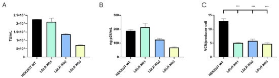 LVV production in HEK293T wild-type and LDLR Knock Out (KO) cells. (A) Infective titre of LVV produced in HEK293T wild-type and the three HEK293T LDLR KO Cell clones previously selected. (B) Physical titre, obtained by p24 ELISA, of the LVV produced in HEK293T wild-type and LDLR KO cells. (C) LVV transduction of producer cells during production (TIPs) in the mentioned cell clones. Statistical analysis was performed for experimental conditions compared to control (HEK293T WT versus LDLR KO cell lines) using one-way ANOVA and the Dunnet test (*** = p < 0.001). Each experiment is the average of two biological replicates. Error bars indicate standard deviation.