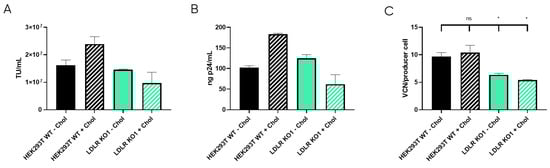LVV production in HEK293T wild-type (WT) and LDLR knock-out (KO) cells with and without cholesterol supplementation. (A) Infective titre obtained in HEK293T WT and LDLR KO clone 1 (KO1) with (+Chol) or without (−Chol) cholesterol supplementation. (B) Physical titre, obtained by p24 ELISA, of the LVV produced in HEK293T wild-type and LDLR KO clone 1 (KO1) with (+Chol) or without (−Chol) cholesterol supplementation. (C) LVV retro-transduction of producer cells during production (TIPs) in the mentioned cell clones. Statistical analysis was performed for experimental conditions compared to control (HEK293T WT–Chol versus the other three groups) using one-way ANOVA and Dunnet test (ns = not significant, * = p < 0.05). Each experiment is the average of two biological replicates. Error bars indicate standard deviation.