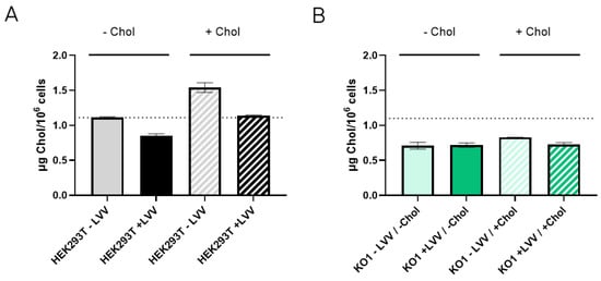 Cholesterol content in LVV producer and non-producer HEK293T and LDLR KO1 cells. (A) Cholesterol content in HEK293T wild-type cells without (filled bar) or with (patterned bar) cholesterol supplementation. Cholesterol content was measured in LVV producer (+LVV, black) and non-producer (−LVV grey) cells. (B) Cholesterol content in HEK293T LDLR KO1 cells without (filled bar) or with (patterned bar) cholesterol supplementation. Cholesterol content was measured in LVV producer (+LVV, dark green) and non-producer (−LVV, light green) cells. Each experiment is the average of two biological replicates. Error bars indicate standard deviation.