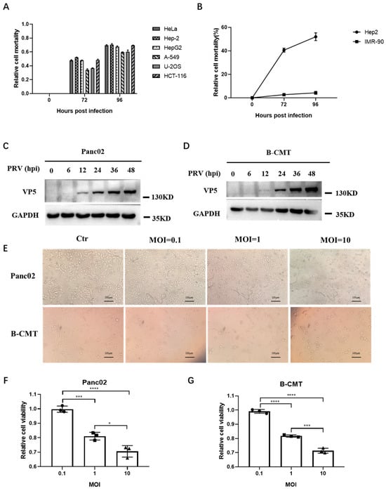 PRV Bartha infects and kills human, mouse, and dog tumor cells. (A) Cell viability assays using CCK-8 kit were performed on six representative human tumor cell lines at 72 h and 96 h after PRV Bartha infection (MOI = 1). (B) Cell viability assays were performed on the human normal cell line IMR-90 and the human cancer cell Hep2 at 72 and 96 h after exposure to PRV Bartha (MOI = 1). (C,D) The expression of PRV VP5 was analyzed by Western blot after PRV Bartha infected the mouse tumor cell line Panc02 and the dog tumor cell line B-CMT (MOI = 1). The cell samples were collected as the indicated time points. GAPDH was used as a loading control. (E) Cell morphology of Panc02 and B-CMT cells 24 h post infection with PRV Bartha at 0.1, 1, or 10 MOI. (F,G) PRV Bartha was used to infect Panc02 and B-CMT. Cell viability was assessed using the CCK-8 kit. Data are presented as the mean ± s.d. values (n = 3). A one-way analysis of variance (ANOVA) was used to determine the significance of differences between the infection groups. * p < 0.05, *** p < 0.001, **** p < 0.0001. hpi: hours post infection.