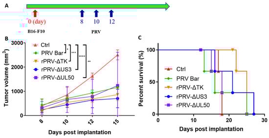 The TK, UL50, and US3 genes of PRV are associated with pathogenicity of PRV. TK and UL50 are involved in viral nucleic acid metabolism, while US3 regulates apoptosis. US3 and UL50 also play a role in viral immune evasion. Importantly, single deletions of these genes from Bartha further improve the safety [30,31,32]. To assess the anti-tumoral efficacy of these different single-gene deletion PRV strains in vivo, we monitored tumor growth and survival rates in the C57/6J B16-F10 mouse melanoma model. The mice were randomly divided into five groups (n = 3), the tumor-bearing mice were treated with DMEM, PRV Bartha, or single-gene knockout PRV Bartha strains (rPRV-ΔTK, rPRV-ΔUS3 or rPRV-ΔUL50), every other day via intratumoral injection for a total of three times when the average tumor volume reached 50–100 mm3 (Figure 2A). As expected, all PRV strains inhibited tumor growth, with rPRV-ΔTK and rPRV-ΔUS3 strains exhibiting better effects (Figure 2B). Considering the overall survival data, rPRV-ΔTK was even better (Figure 2C). These data demonstrate that all PRV strains examined exhibit anti-tumoral efficacy in vivo, with rPRV-ΔTK emerging as the most promising oncolytic virus candidate.