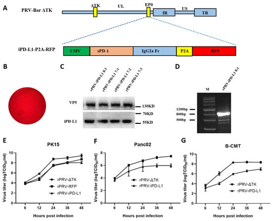 To enhance anti-tumor activity, we inserted a PD-L1 inhibitor (iPD-L1) driven by the human cytomegalovirus (hCMV) promoter into the EP0 locus of PRV-ΔTK (Figure 3A). We named the new recombinant virus rPRV-iPD-L1. iPD-L1 expresses a fusion consisting of a murine soluble PD-1 extracellular domain and an IgG Fc fragment, which has been shown to strongly inhibit the binding between PD-1 and PD-L1 [33]. The donor plasmid expresses iPD-L1 linked to RFP via a P2A (porcine teschovirus-1 2A) self-cleaving peptide. The plasmids of the CRISPR/Cas9 system, the donor plasmid expressing iPD-L1 and the genomic DNA of PRV-ΔTK, were co-transfected into PK15 cells. Plaques exhibiting red fluorescence (Figure 3B) were then screened and purified over ten rounds. Western blotting analysis confirmed the expression of iPD-L1 in infected cells (Figure 3C). PCR showed that the iPD-L1 DNA was inserted into the genome of PRV (Figure 3D). Agarose gel electrophoresis of the PCR product exhibited a band size consistent with the expected size, indicating successful amplification. The band was then sent for sequencing, confirming the successful construction of rPRV-iPD-L1. rPRV-iPD-L1 showed a slower replication rate than rPRV-ΔTK in PK15 cells (Figure 3E). Similar results were observed in mouse and dog tumor cells Panc02 and B-CMT (Figure 3F,G).