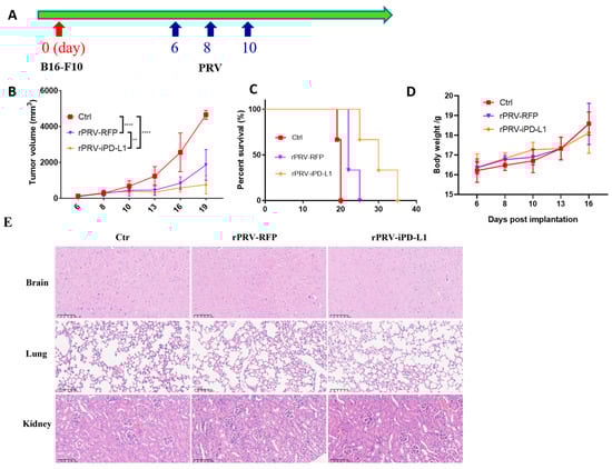 Anti-tumor activity of the recombinant strain rPRV-iPD-L1 in vivo. (A) Workflow for the B16-F10 melanoma tumor model and oncolytic virus treatment. (B) After tumors reached 50 mm3 to 100 mm3, all mice were randomly divided into three groups of three mice per group. Each mouse was intratumorally injected with either DMEM, 1 × 106.5 TCID50 of rPRV-iPD-L1, or rPRV-RFP in volumes of 100 μL every other day for a total of three times. Tumor volumes were measured approximately every 2 to 3 days and are presented as n = 3. (C) The overall survival rate of C57/6J mice bearing B16-F10 melanoma treated with rPRV-iPD-L1, rPRV-RFP, or the control group. (D) The body weight of each group after treatment. (E) On the 16th day, brain, lung, and kidney samples were taken for HE staining in each group. The image displayed represents one mouse from each group, with 20× magnification (Scare bar = 100 μm). ** p < 0.01; **** p < 0.0001.