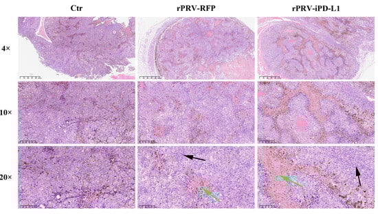 Histopathological examination of tumor tissues from mice treated with PRV. The image displayed represents one mouse from each group and is shown at 4×, 10×, and 20× magnification (Scale bar = 100 μm). The green arrows indicate focal necrosis of tumor cells, a result of treatment with PRV. The black arrows indicate infiltration of tumor tissue by inflammatory cells, a common response to infection or injury.